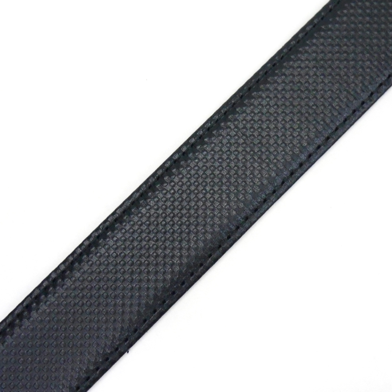 傷がつきにくい型押しレザーを使用し、サイズのアジャストがしやすい穴無しバックルを採用しています。