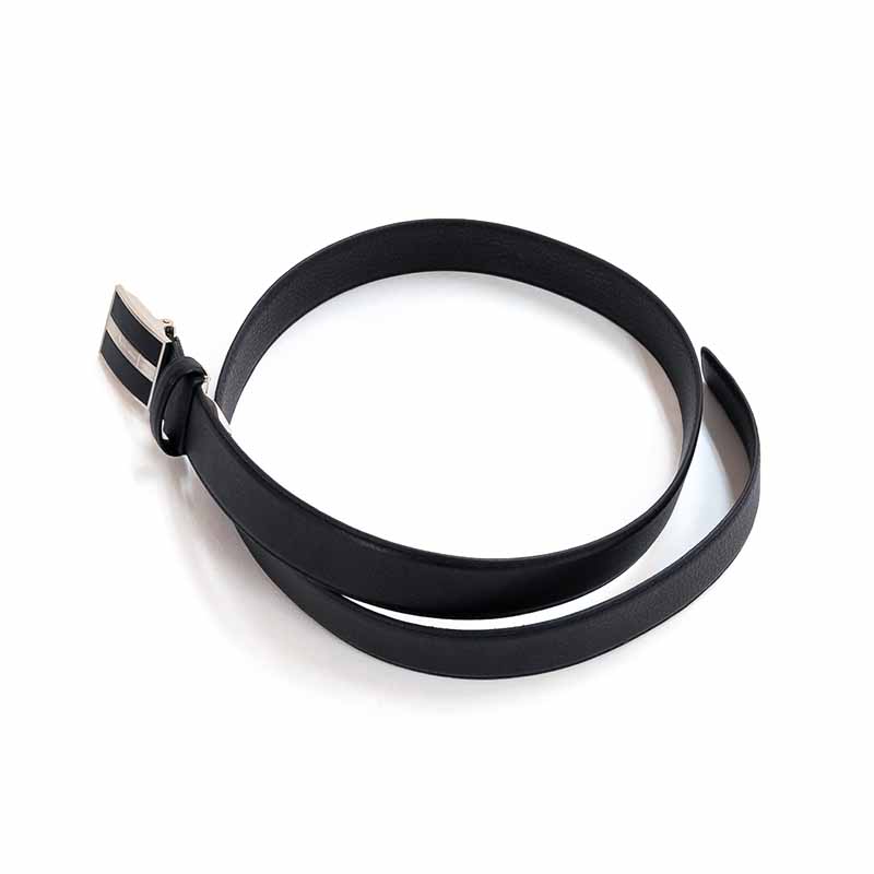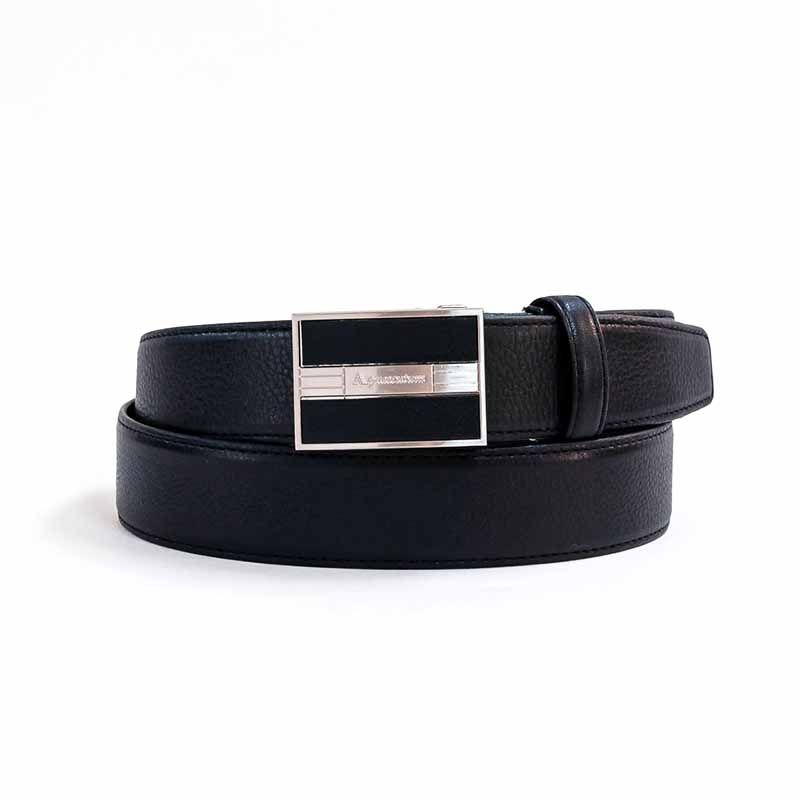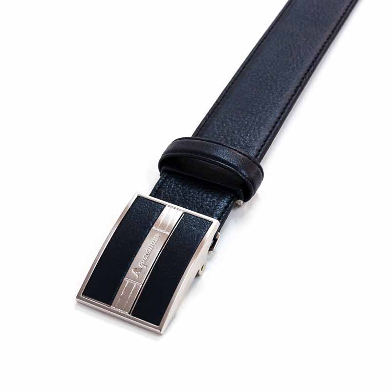 Aquascutumのロゴをセンターに配置したスクエアのバックルに、手触りの良いシボレザーを使用して日本の職人が仕立てたベルトです。