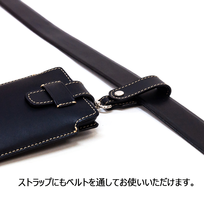 ケースをベルトに装着する方法は、ベルトループにベルトを通す方法と、付属のストラップにベルトを通す方法の二つです。ストラップには回転式のナスカンが付いているので、ストラップを使ってベルトに通すケースが自由に動くので、アウトドアでの作業や動きに対応して違和感なく装着して動けます。