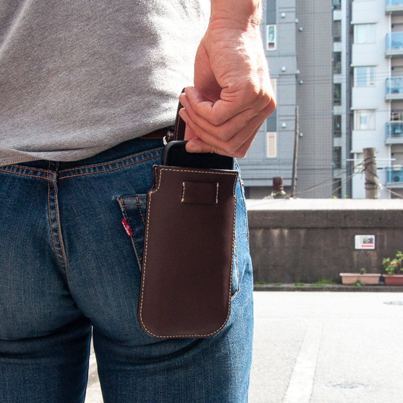 かさ張るスマートフォンをケースに入れてベルトに装着することで、いつでもハンズフリーの常態を保つことができます。散歩や旅行、キャンプなどアウトドアに活躍するアイテムです。