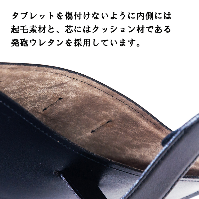 中には裏地やクッション性のあるの芯材などで電子機器に負担のないように仕上げています。主にiPad Air (第5世代)・iPad (第9世代)などが収納可能です。