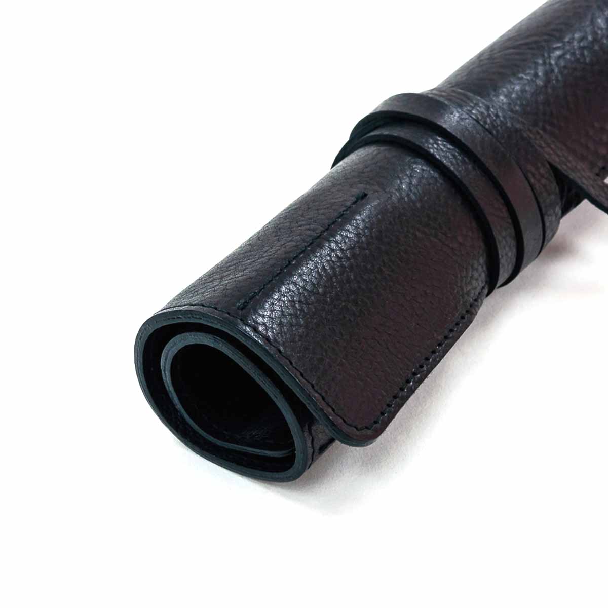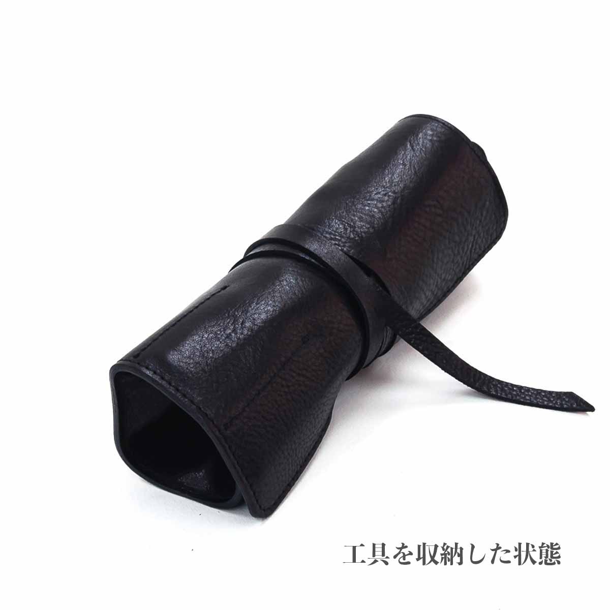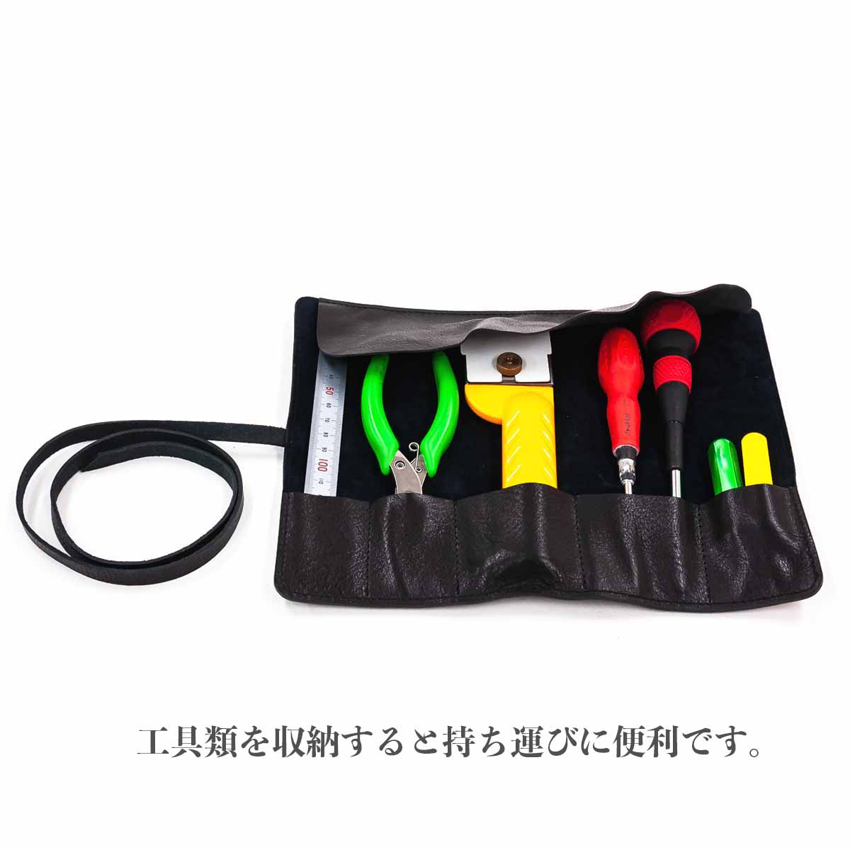 オフィスでのデスクワークから在宅時でのデスワークにも使えるロール式のペンケースです。文具雑貨の収納はもちろんちょっとした工具の収納もできる仕様のアイテムです。革ひもでしっかりとめる仕様なので中の収納モノに合わせて最適なサイズ感で持ち運びできるように作られています。