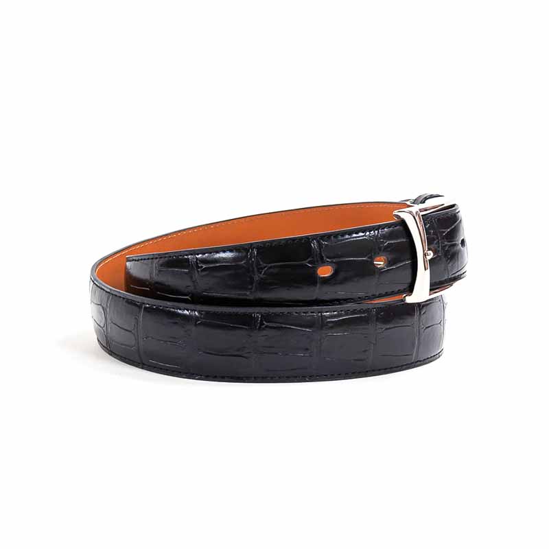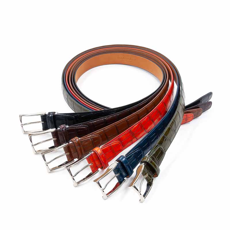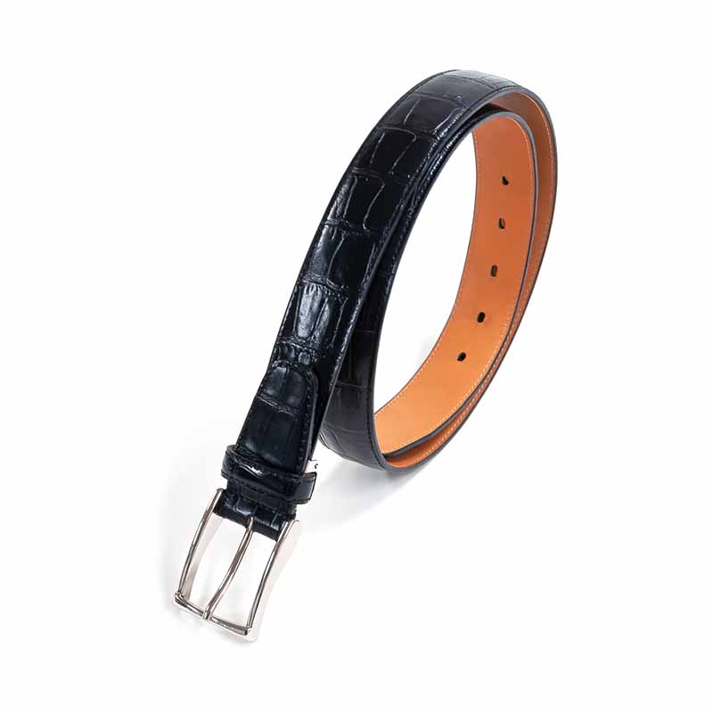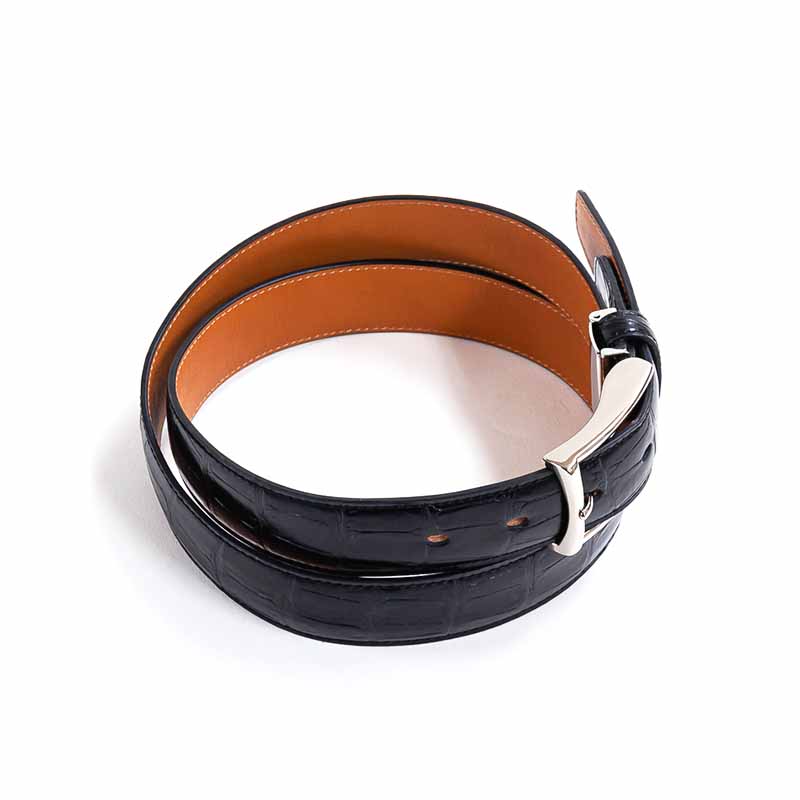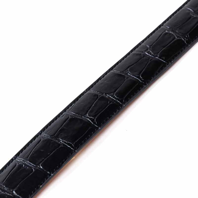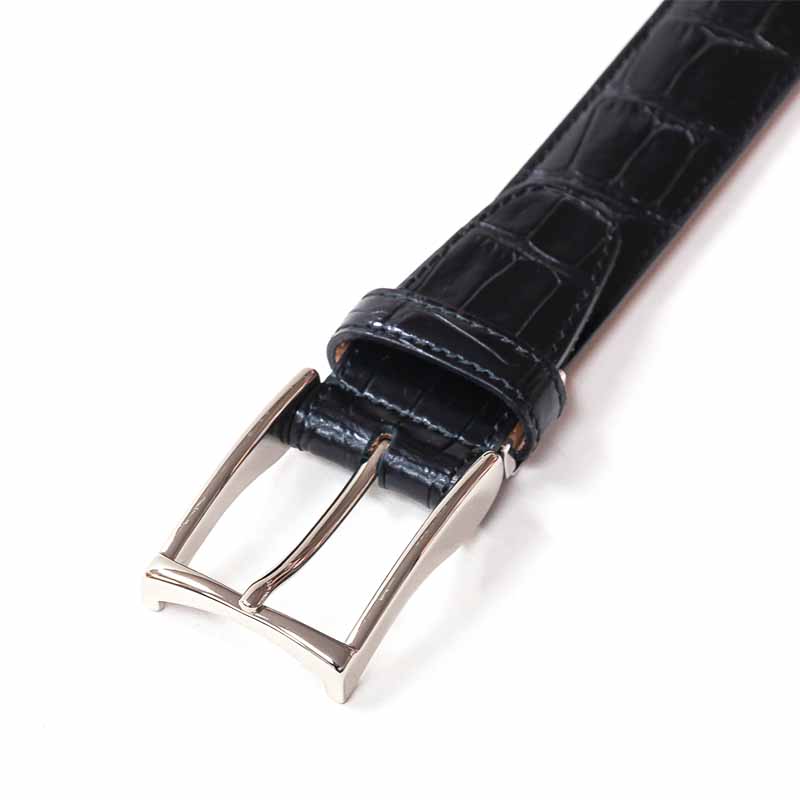 イタリア製の型押し専門メーカーの「メリディアーナ社」のクロコダイルの型押しを使用した3.3cm幅のベルトです。専門メーカーならではの精巧な型押し技術で本物と見間違うかのようなクォリティーです。