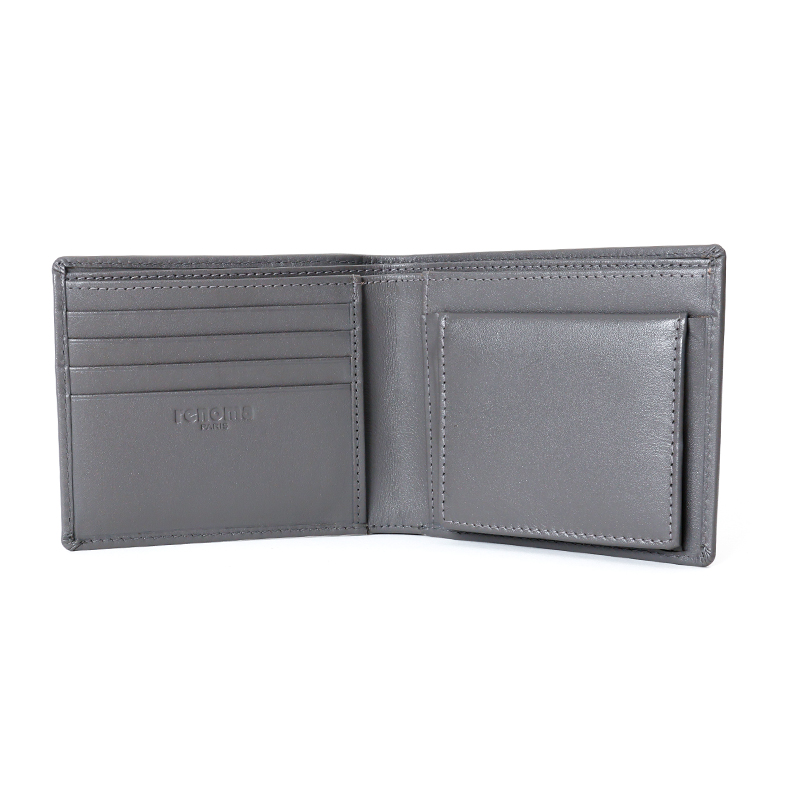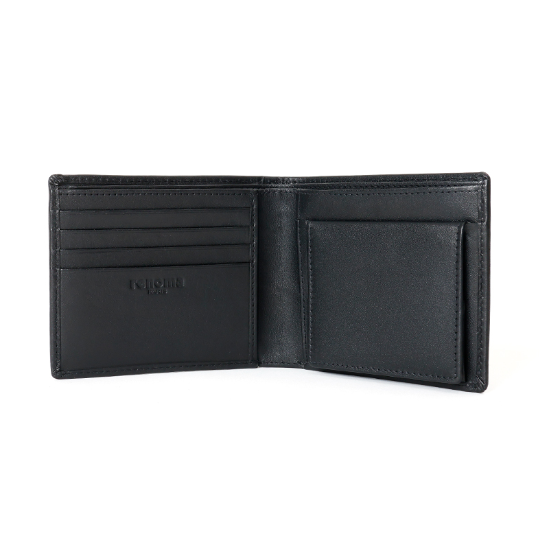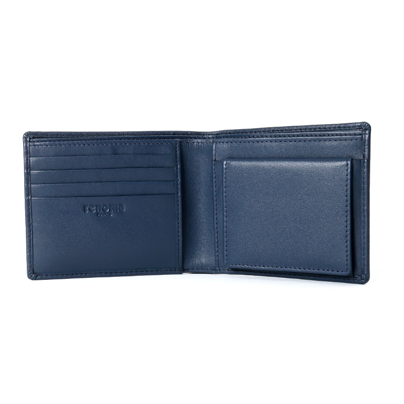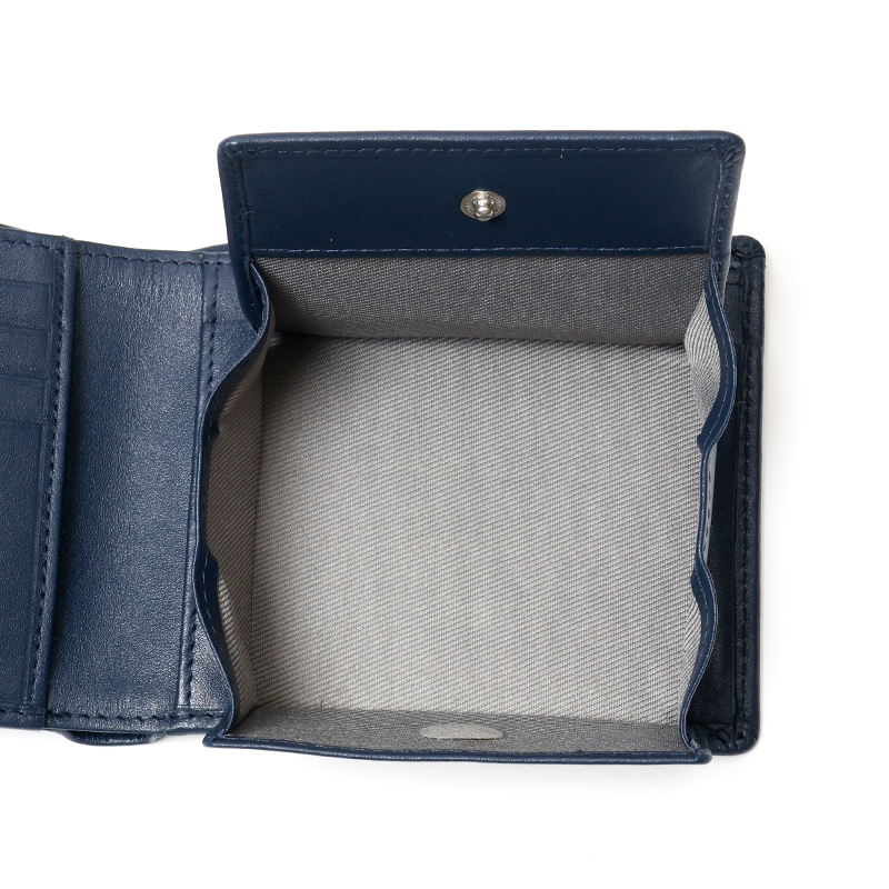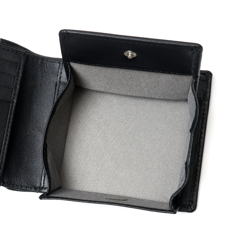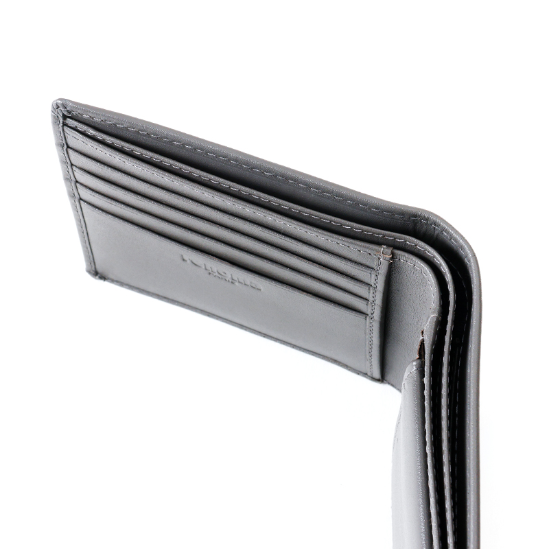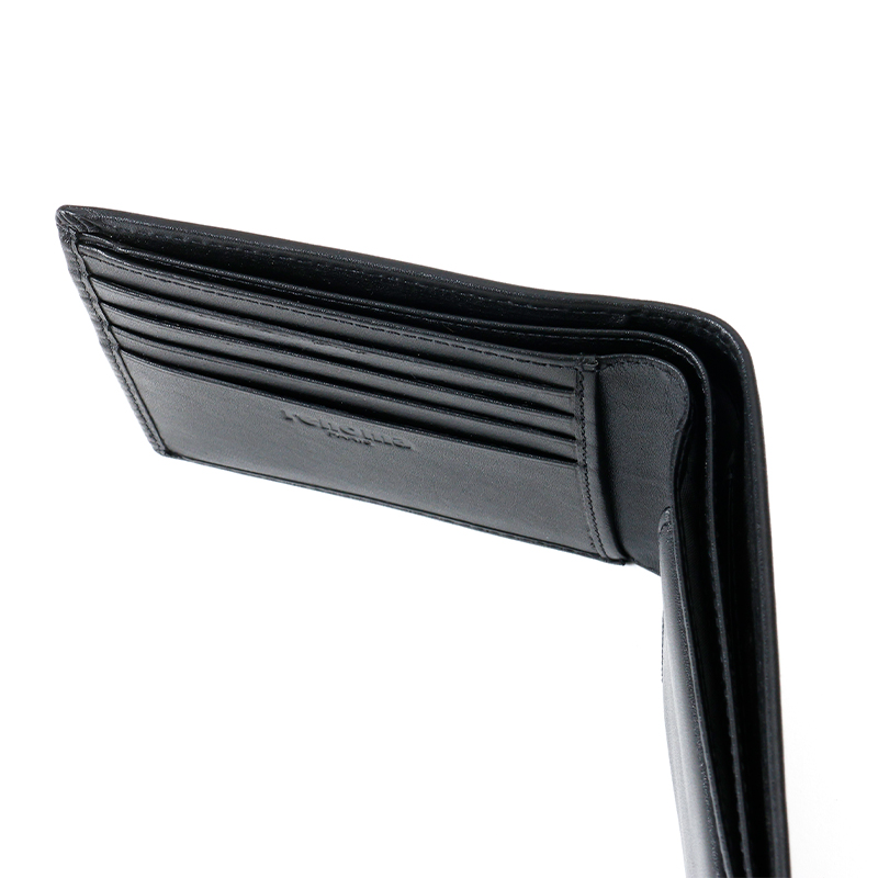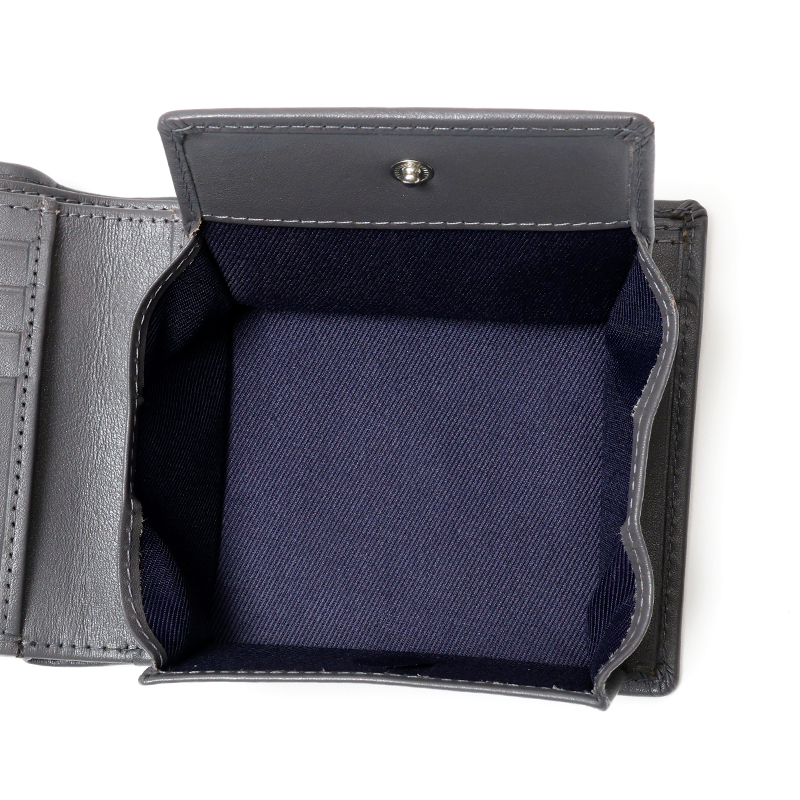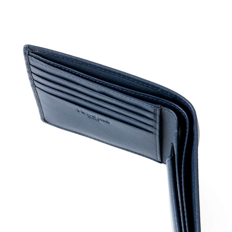 ベーシックな見た目の二つ折り財布はBOX型の小銭入れを採用しており、小銭が見やすく取り出しやすくなっています。