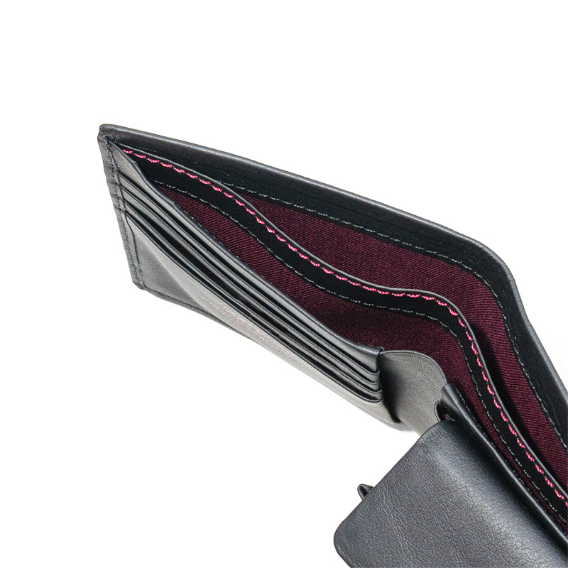 スタンダードな形の二つ折り財布で、カード段が4か所とポケットが3つあります。