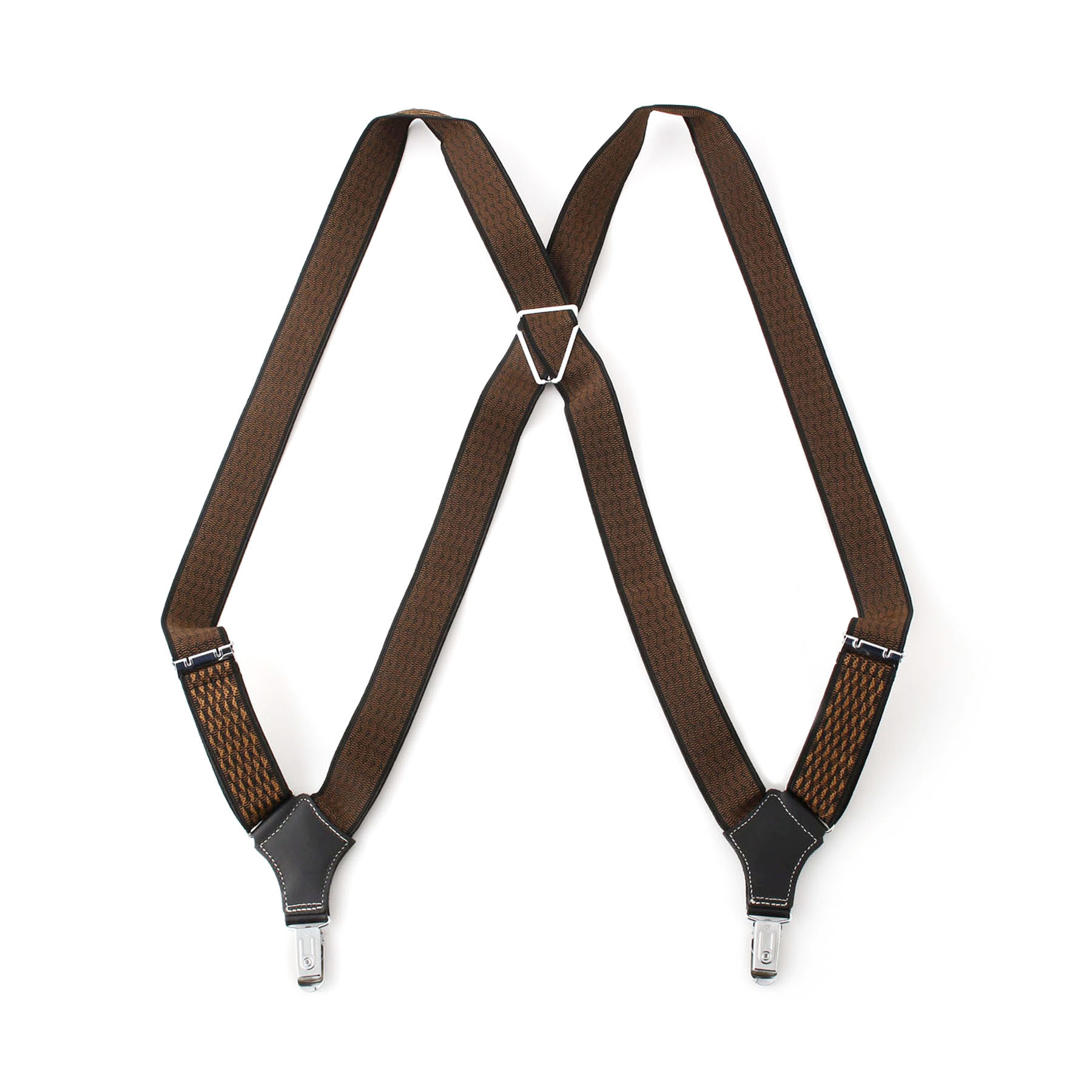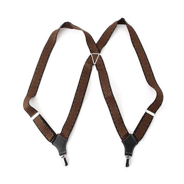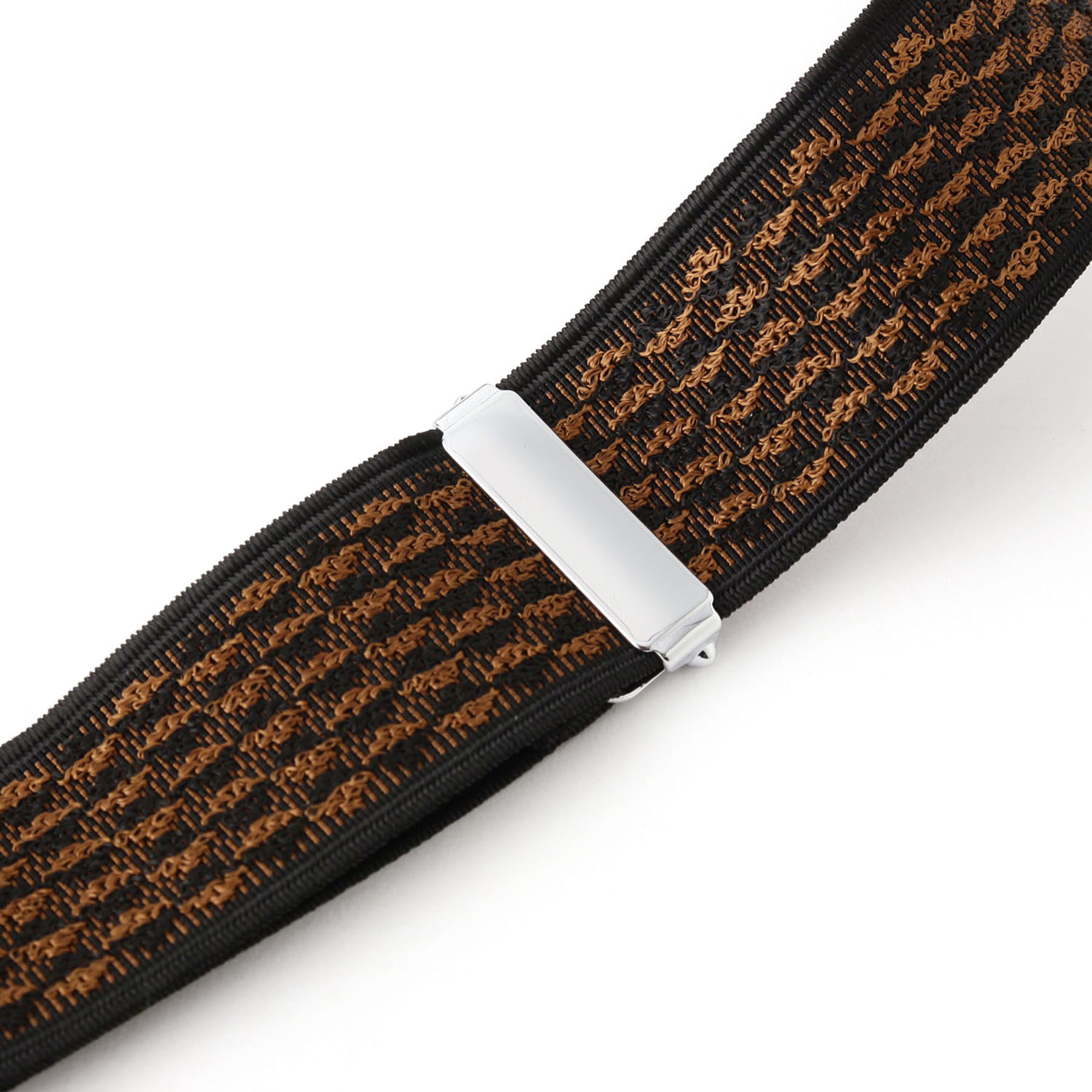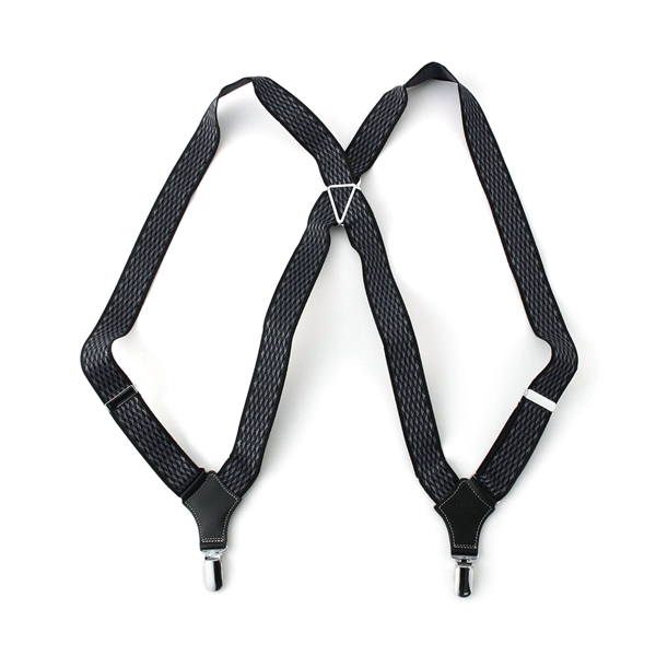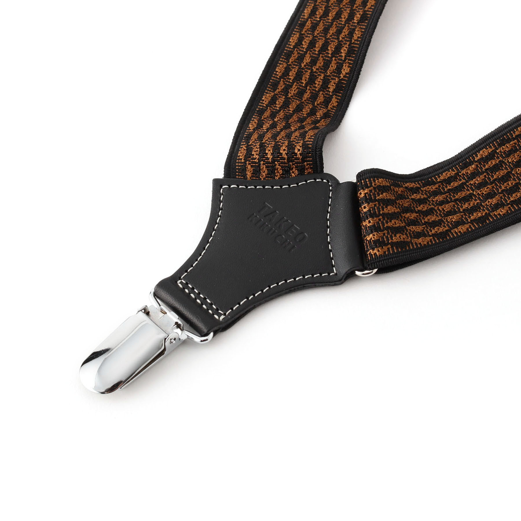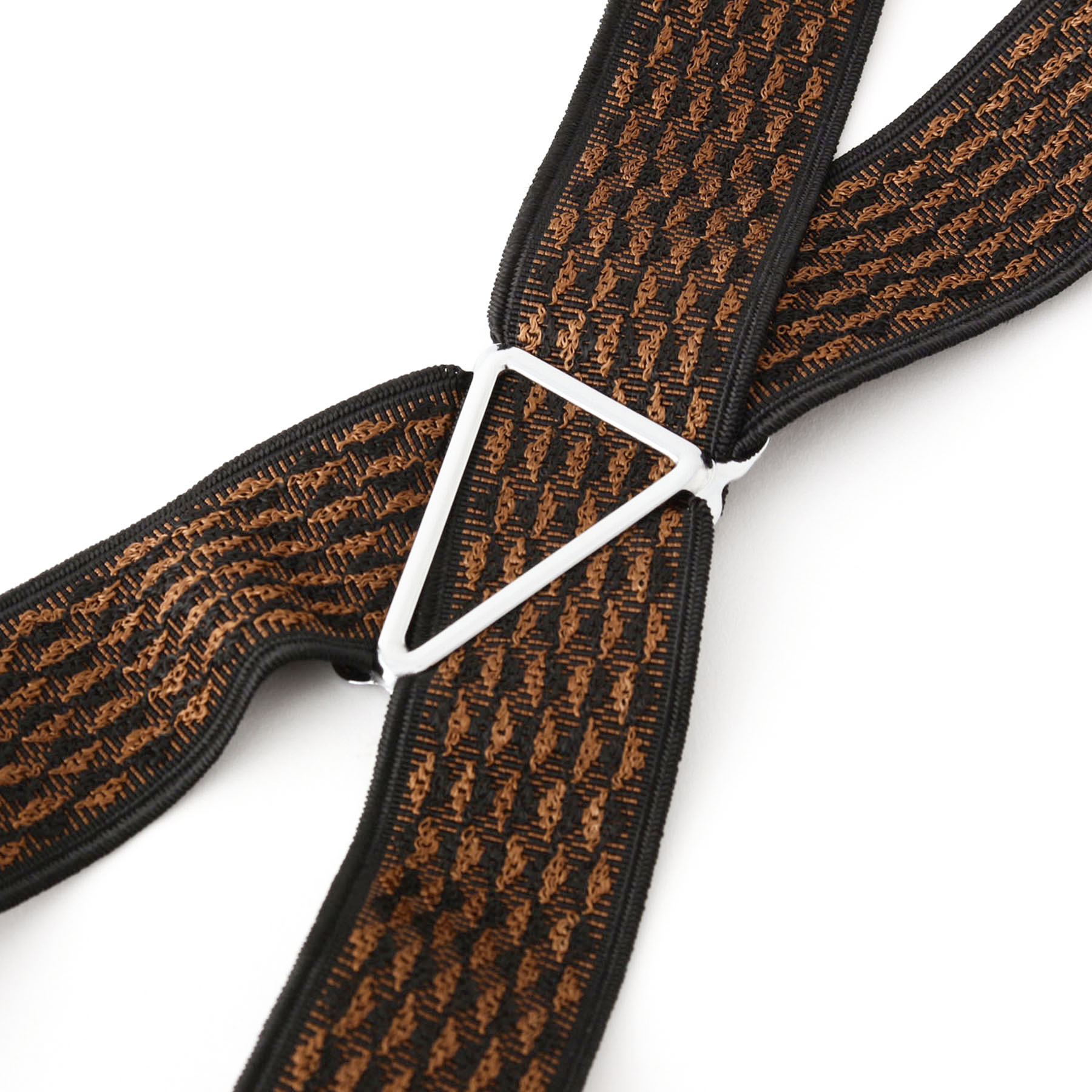 カラーの幾何学柄の伸縮ゴム帯を使用したサイドへのホルスター型2点留めタイプのサスペンダーです。伸縮でフィットし、サイズも金具部分で調整し、最小66cm~101cmまで変更可能です。