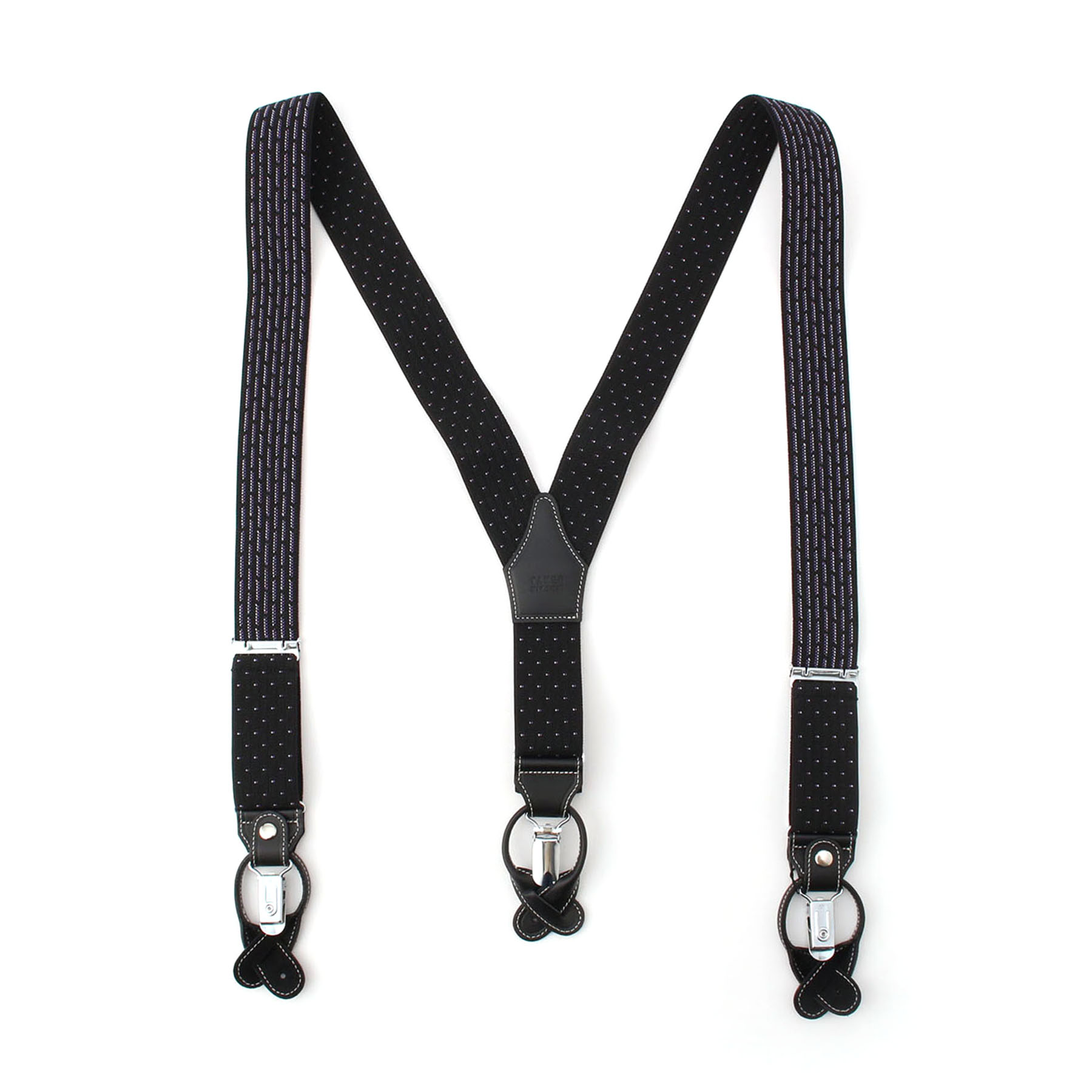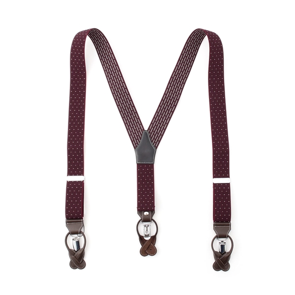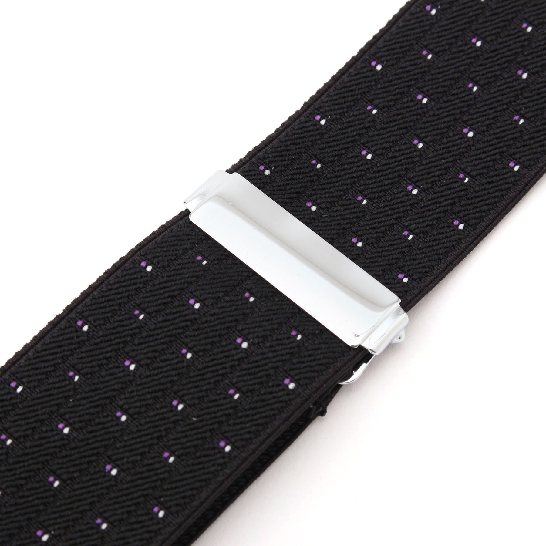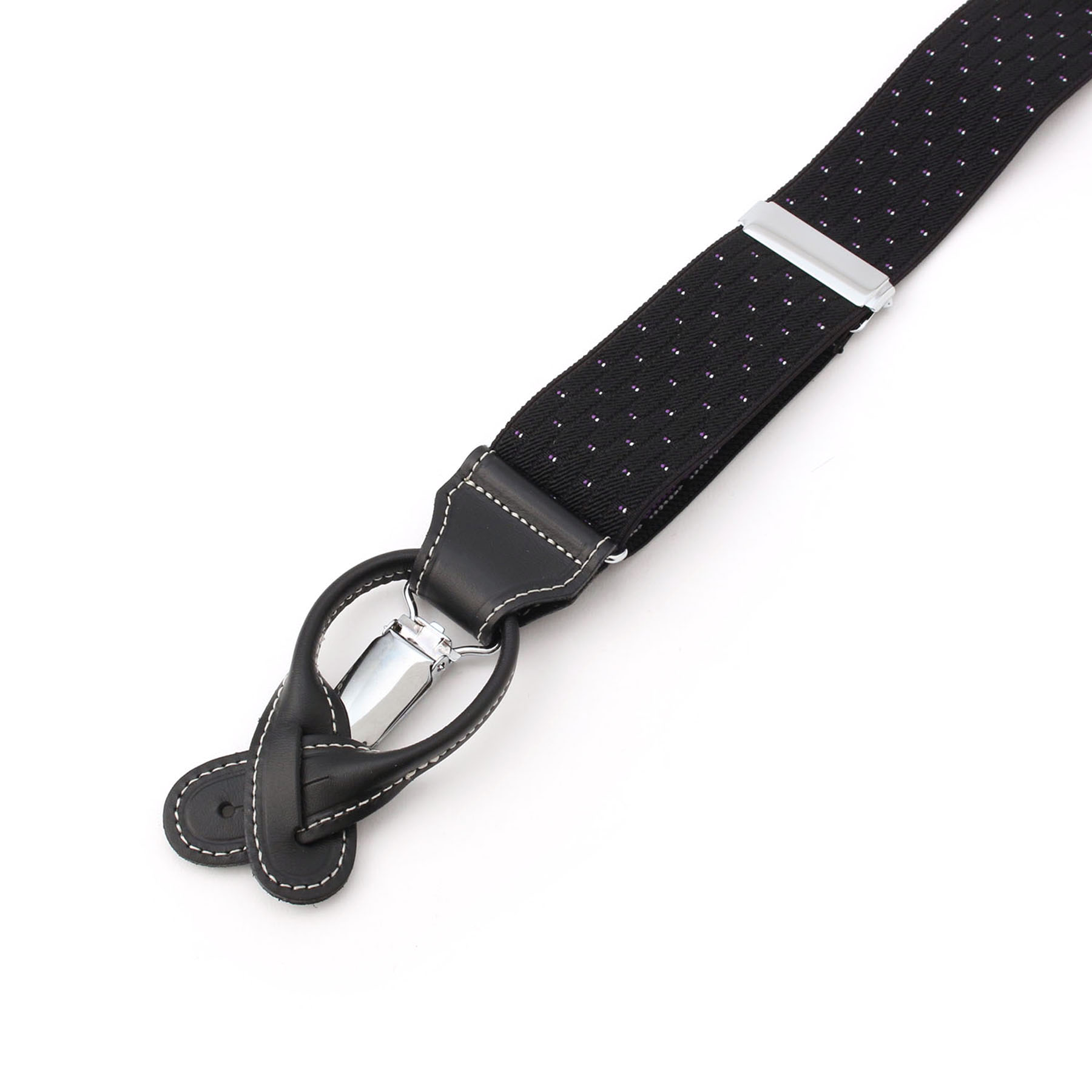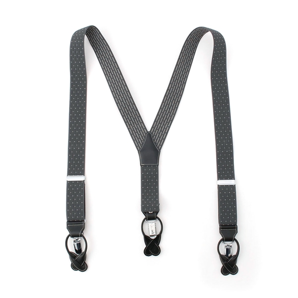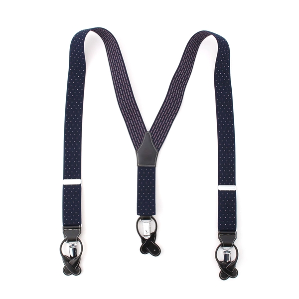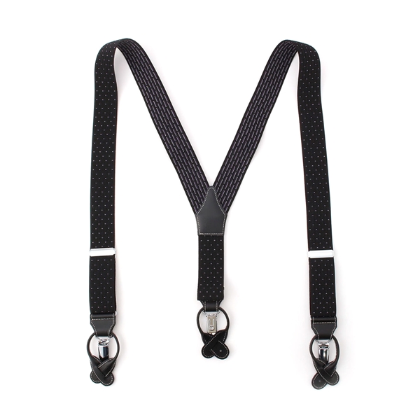 ベルギー製のドット柄伸縮ゴム帯を使用したY字型3点留め仕様のサスペンダーです。伸縮でフィットし、サイズは金具部分で調整できる仕様になっています。