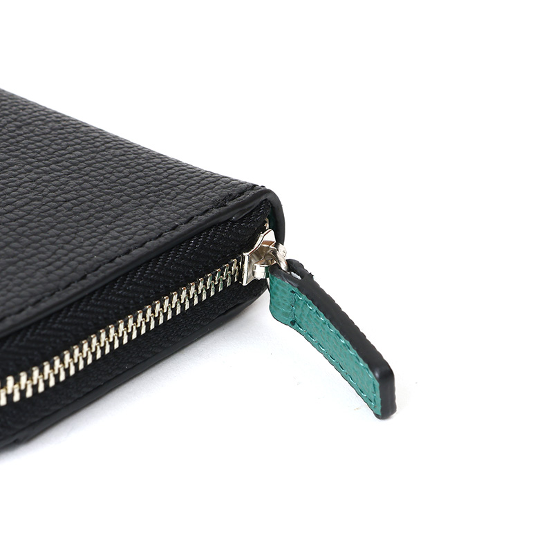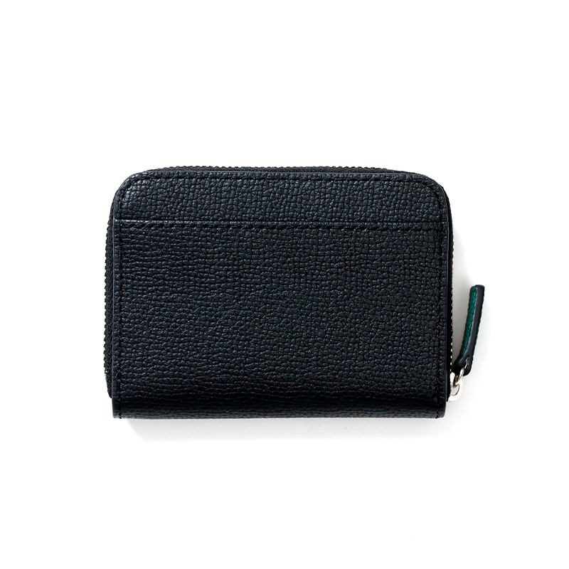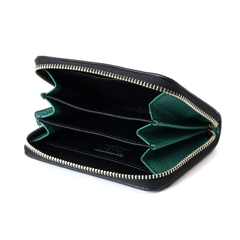 口が大きく開くラウンドファスナーを採用しており、小銭は3室に分かれています。