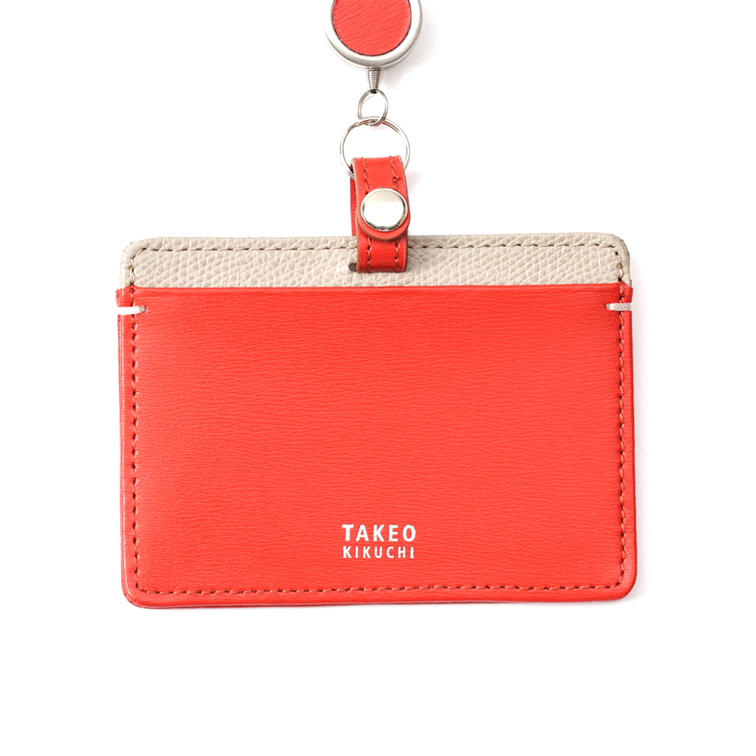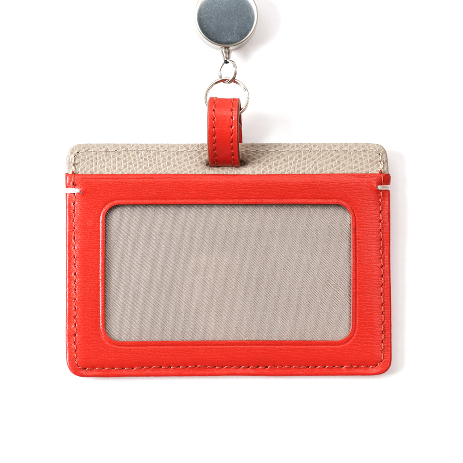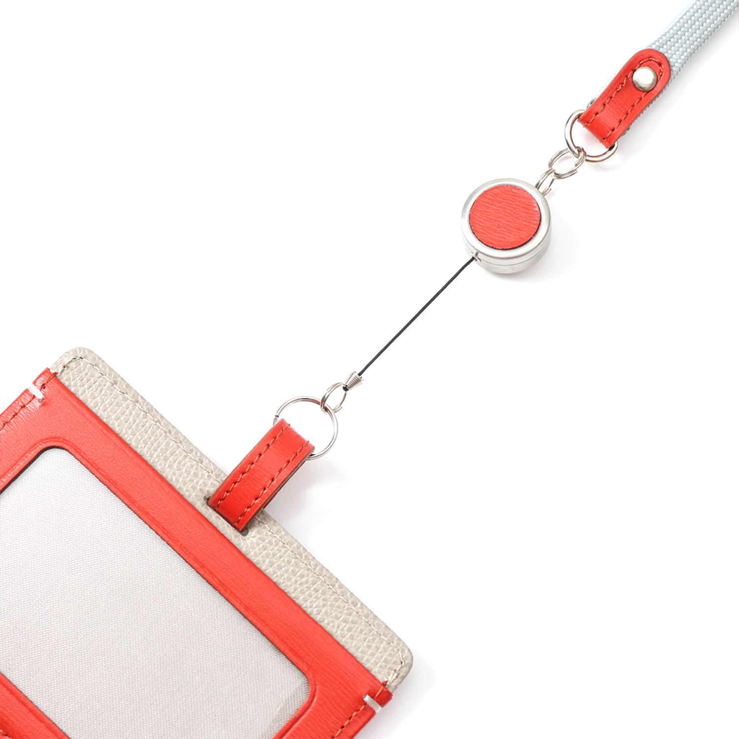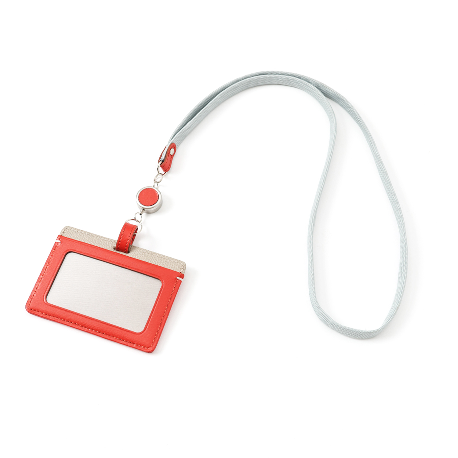 IDケースは伸縮リールがついた使い勝手の良い仕様で、首紐にはあえて革でなく、首あたりのやさしいポリエステル素材を採用しました。