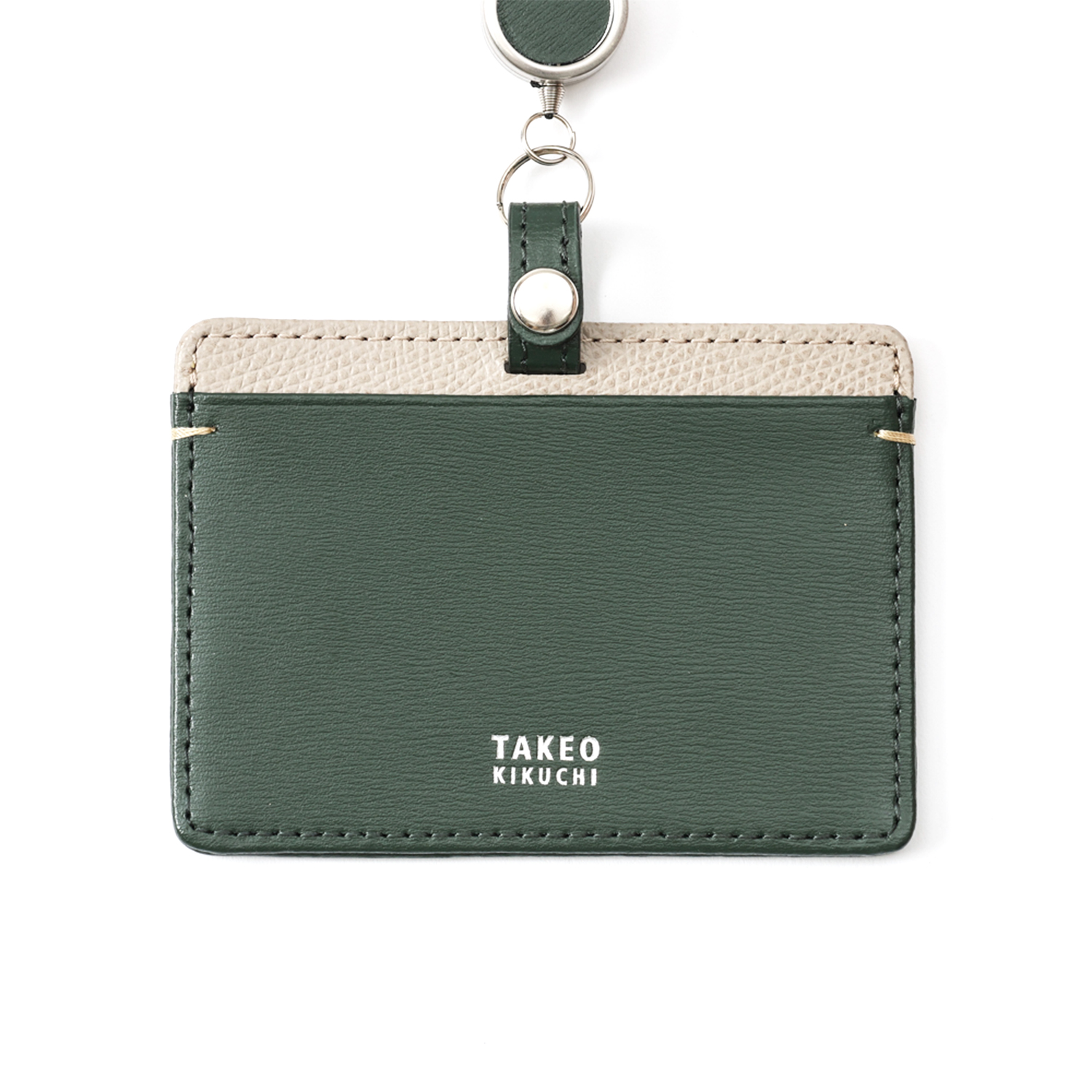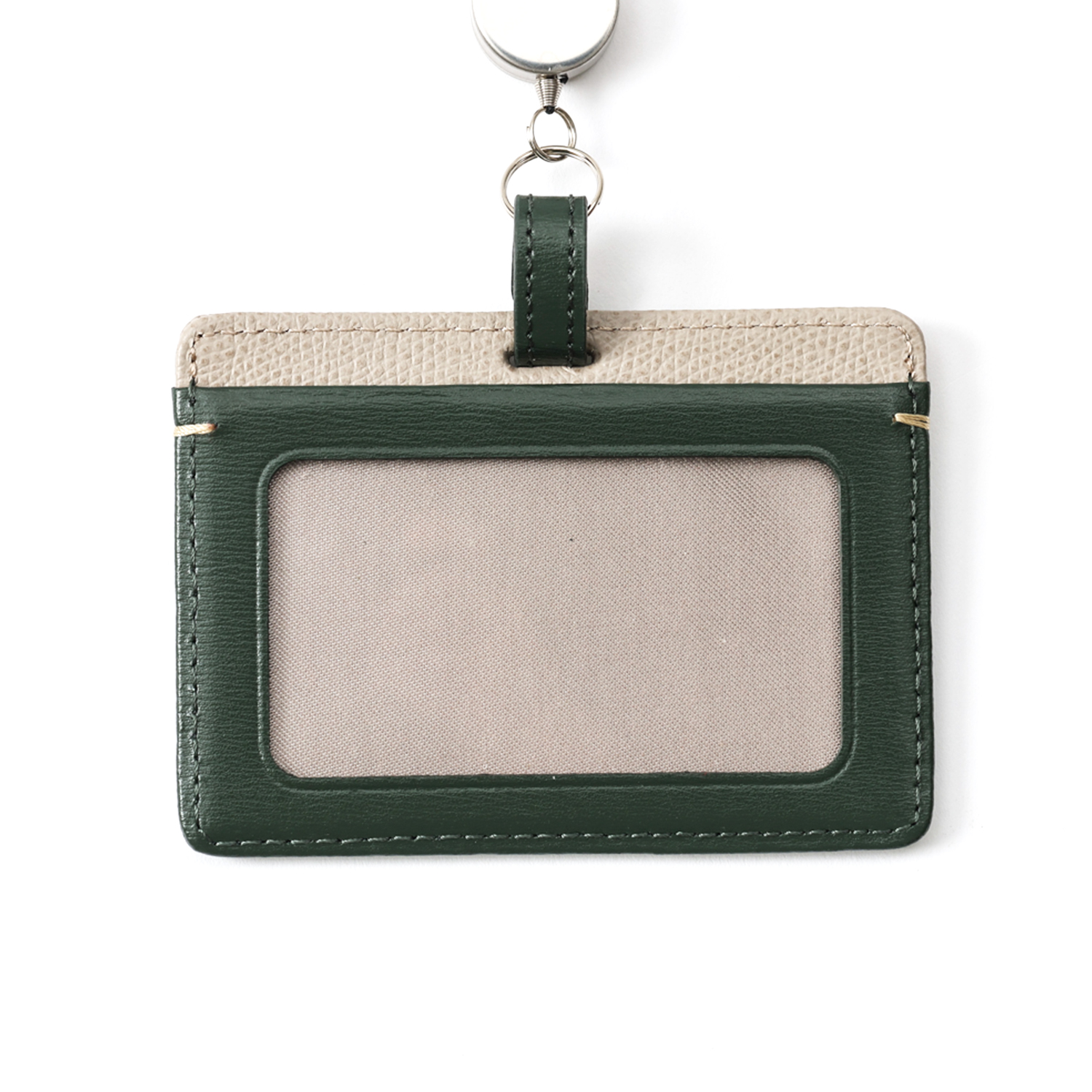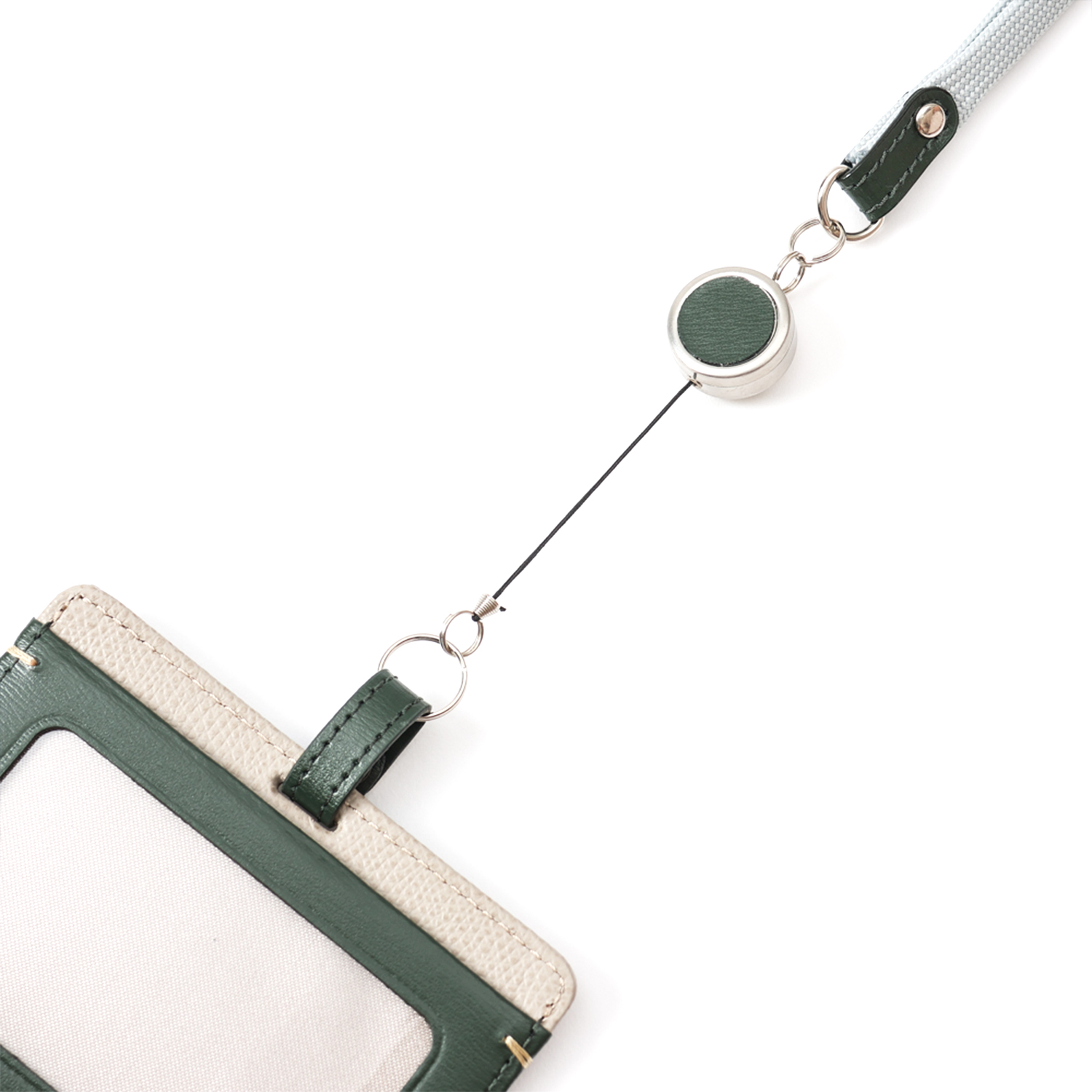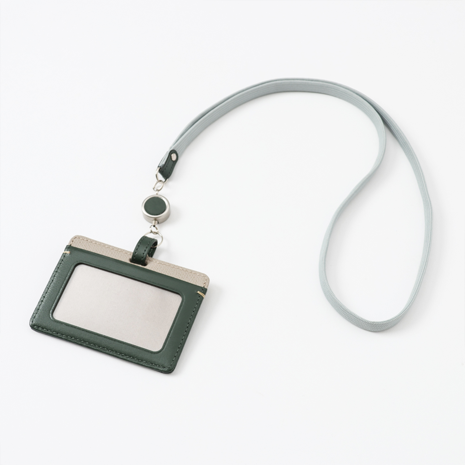 IDケースは伸縮リールがついた使い勝手の良い仕様で、首紐にはあえて革でなく、首あたりのやさしいポリエステル素材を採用しました。