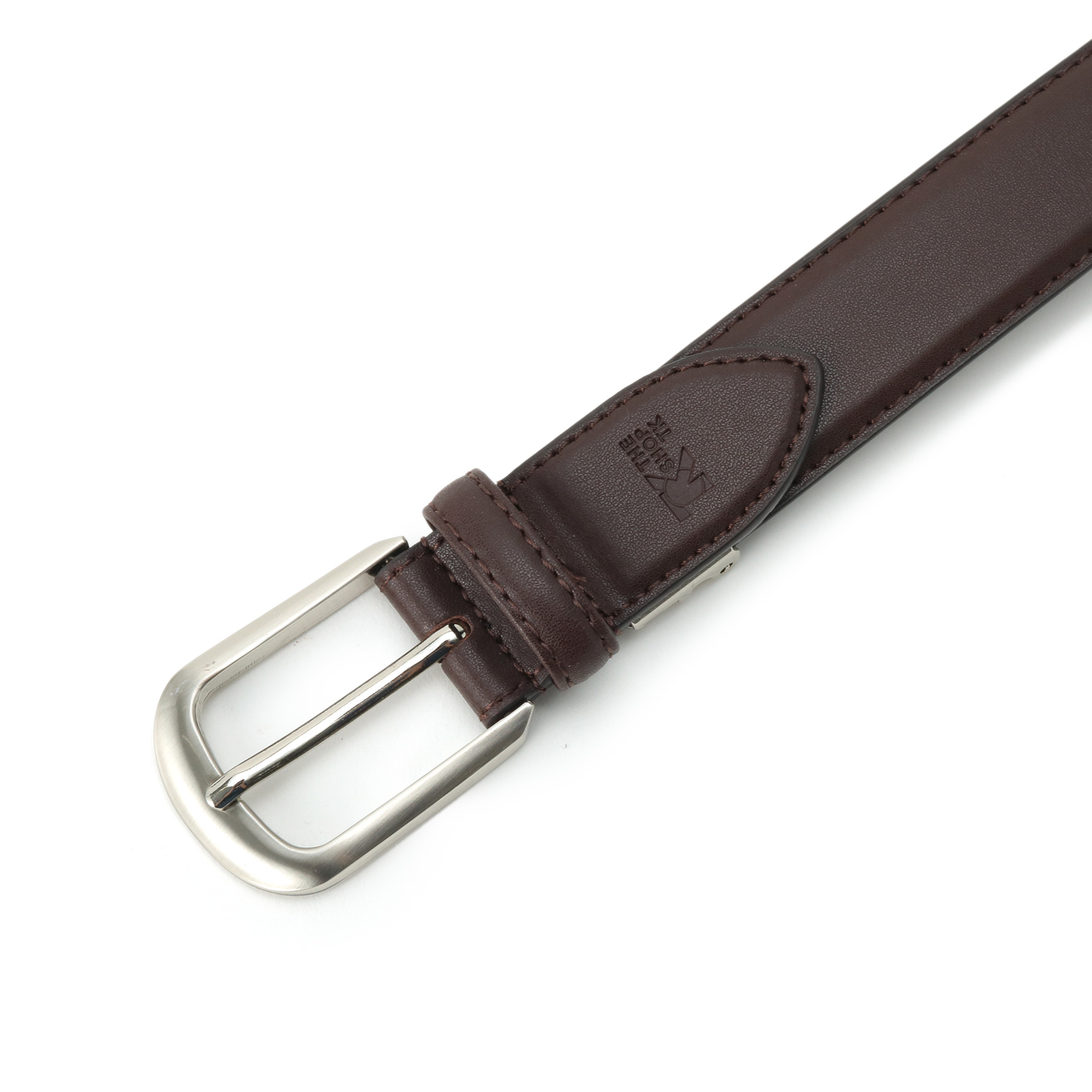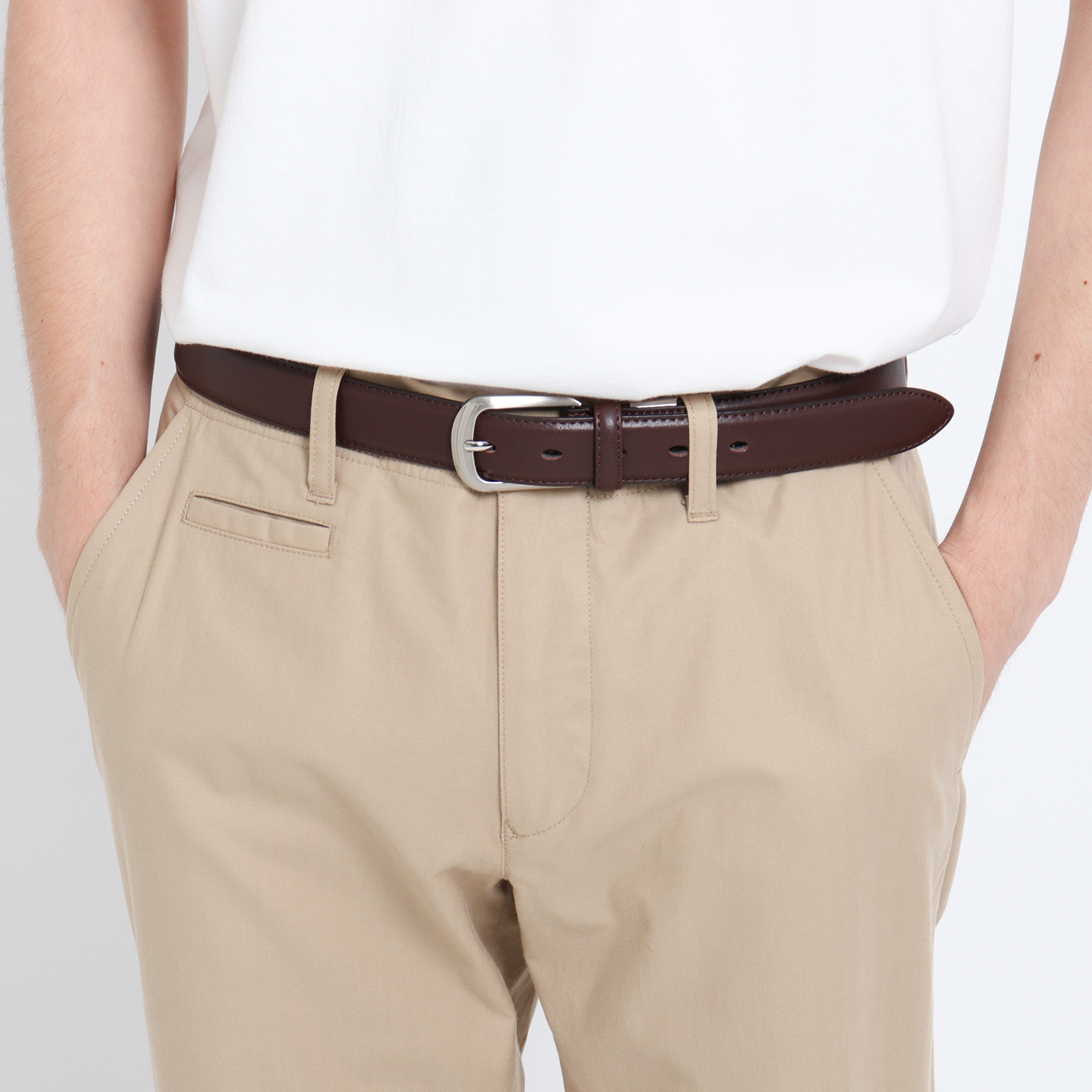 ラウンド型のバックルデザインベルトです。帯はシンプルにし、スムースレザーを使用したビジネス仕様です。スーツはもちろんチノパンスタイルにも合わせやすいアイテムです。シンプルなのでコーディネートの幅を広げてくれます。